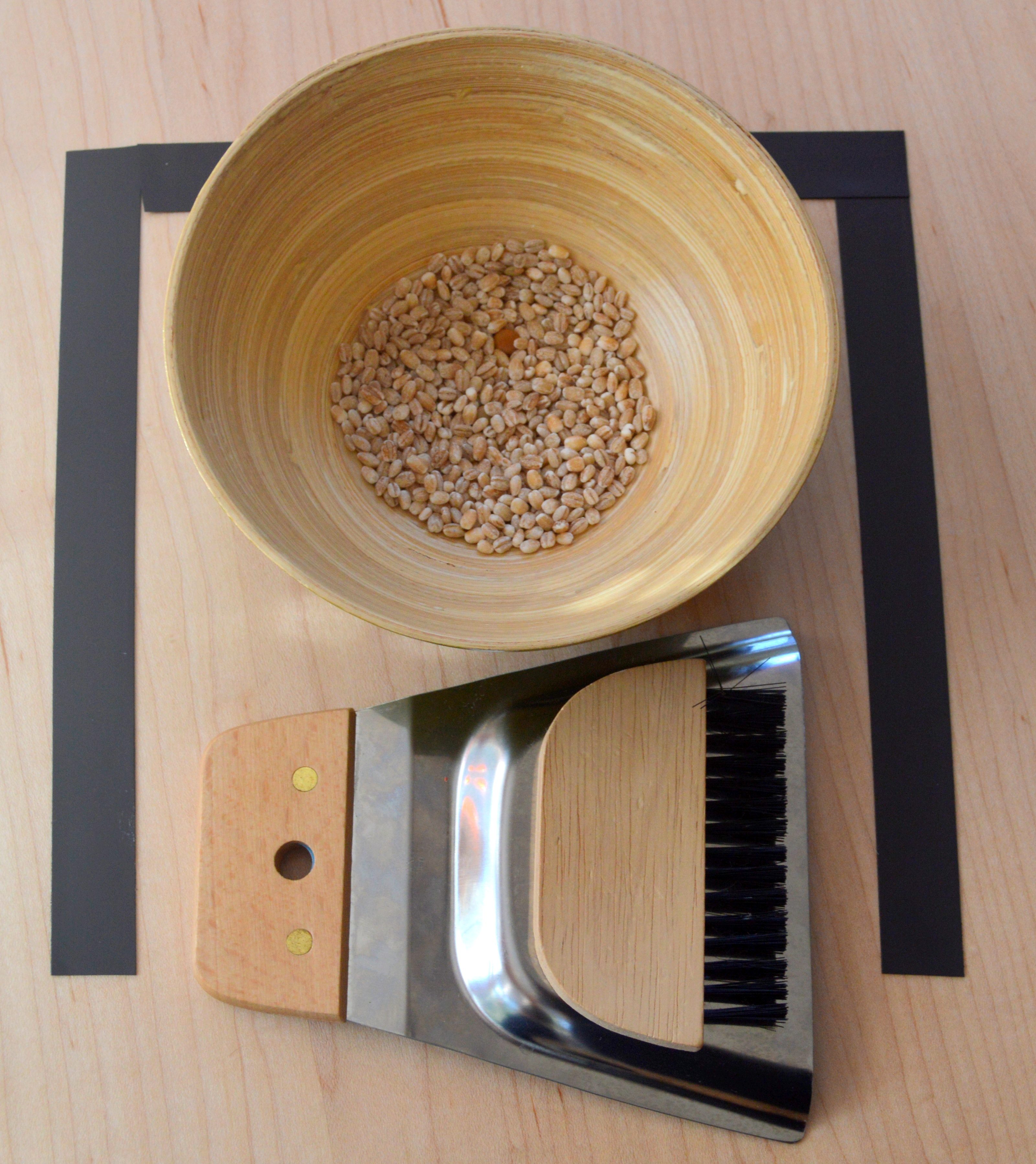 Practical life activities can be introduced to a toddler as early as 15 months. I started offering to Adrian crumbing the table activity at around 26 months. This small crumb set is perfect for table-top crumbing. The activity can be practical indeed, like asking your toddler to help clean up crumbs or food pieces after a dinner, or prepared, like here, where you would use any type of grain, dry pasta or seeds, and a defined area to clean (I used a black magnetic tape that I re-use to define a square).