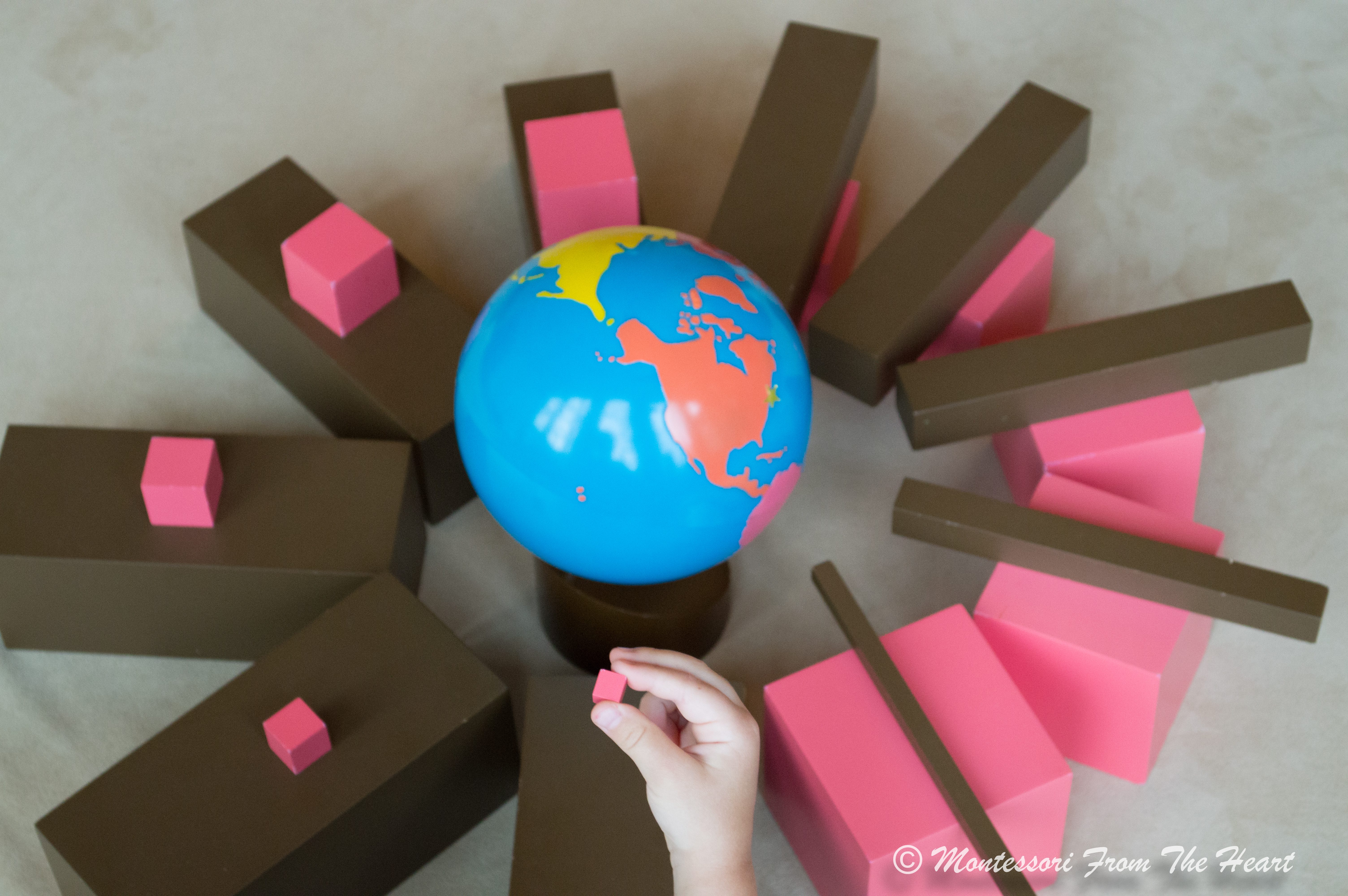Pink Tower consists of 10 pink wooden cubes with width graduated in increments from 1 cm (which is 3/8" on each side) to 10 cm or 1 cubic centimeter to 1 cubic decimeter. Any 2 successive cubes vary in 3 dimensions: length, width and height, thus making their difference in size reasonably obvious to a child. Pink Tower is a material for teaching size, where cubes increase progressively in the algebraic series of the third power according to the numerical series.