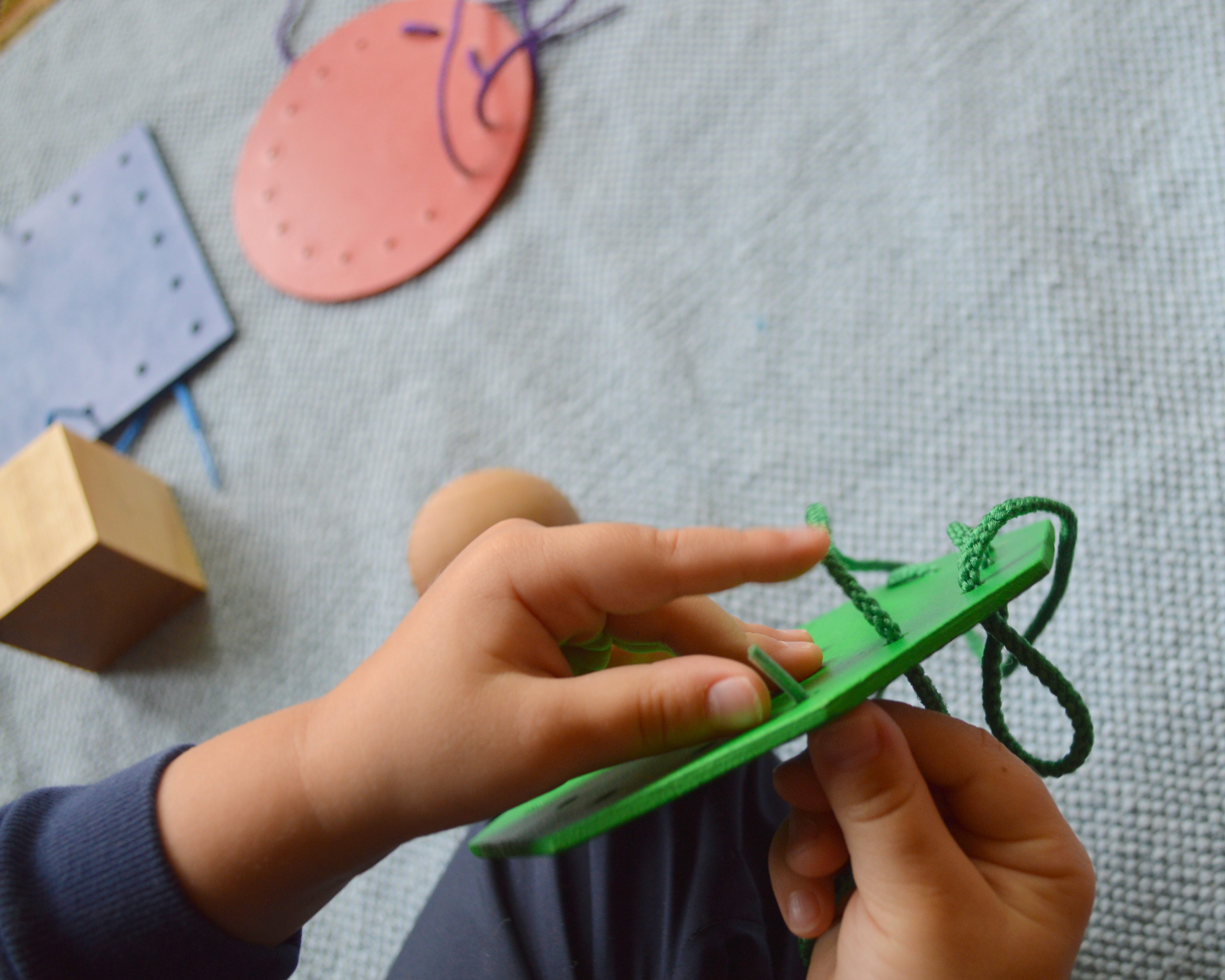I first introduced this activity to Adrian at around 18 months, but at that time, he was not ready for actual threading. Now, Adrian quickly learned the lacing-stitch as he threaded laces through the pre-punched holes over and over :)