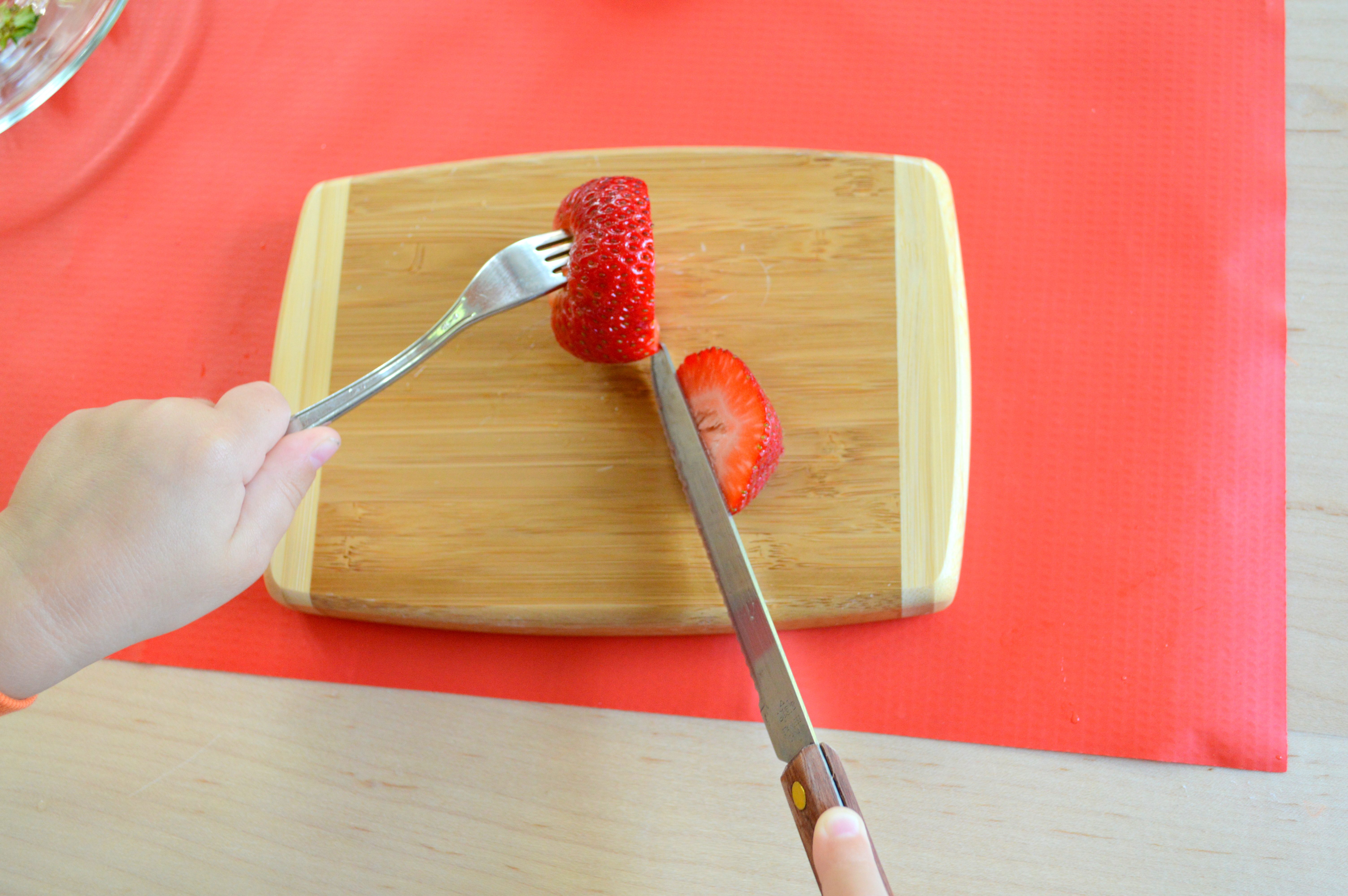 p.s. Here, Adrian is using other tongs to transfer strawberries. And here, he is Making a Smoothie to his sister