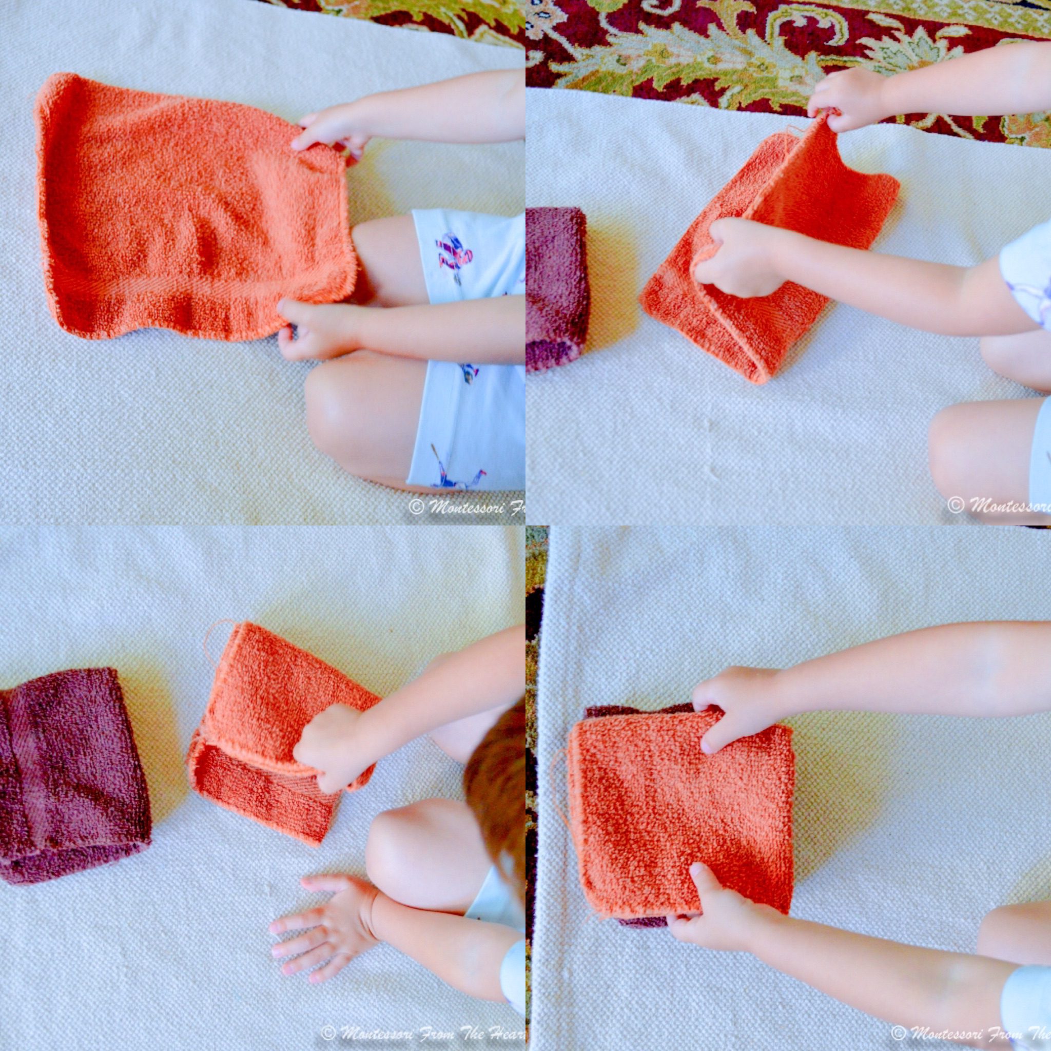 A traditional Montessori folding lesson would offer a child a cloth (buy here) with four different stitched folding patterns. The cloths have stitched folding lines in a contrasting color along the folding lines. Each set includes four cloths, each with a different stitched folding pattern. These cloths give children a chance to practice folding, gain confidence, and then apply folding skills to putting away towels and cloths. This lightweight lacquered hardwood folding cloth tray (buy here) is perfectly sized for this folding activity.