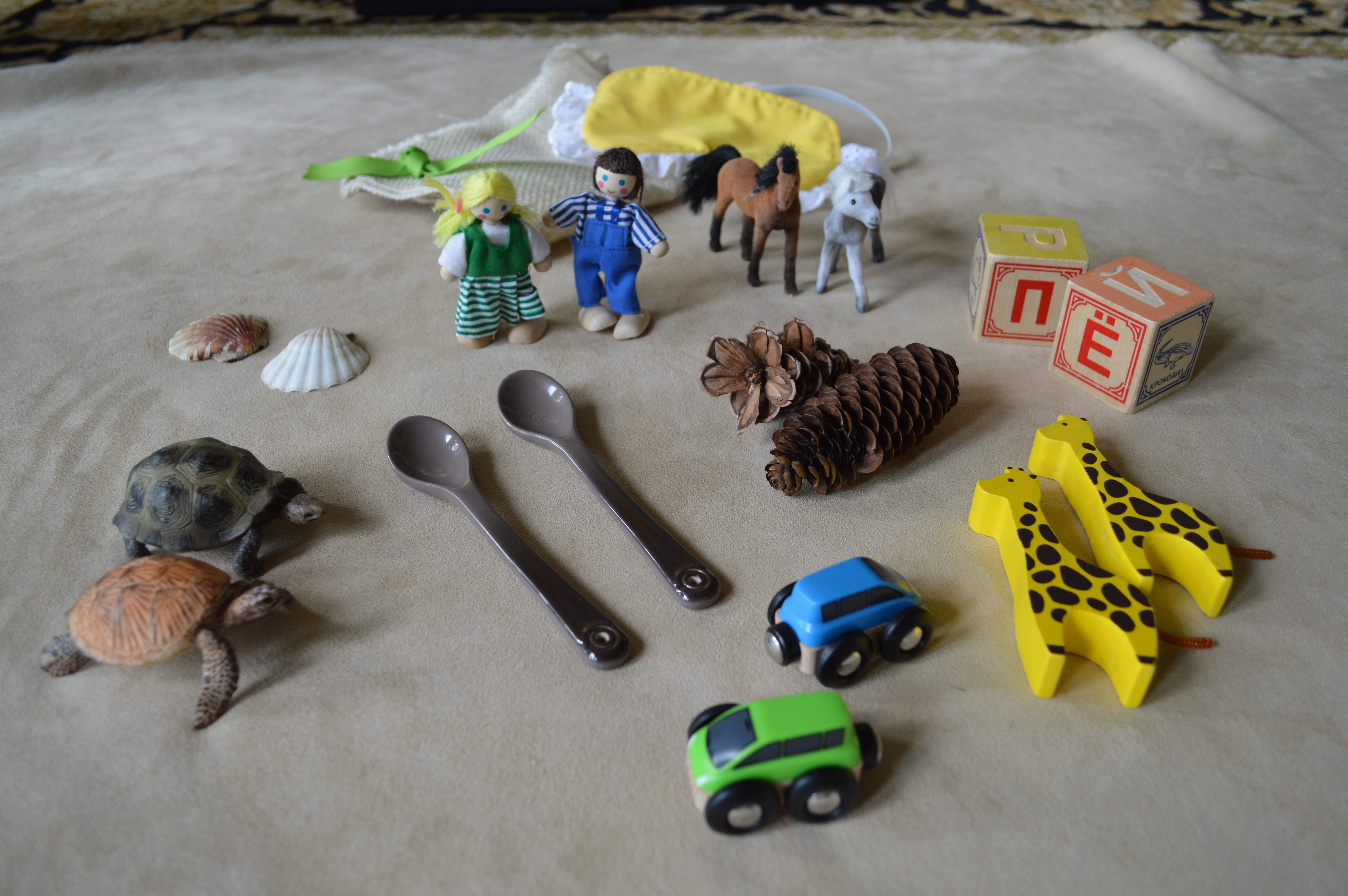 Today, we are trying the (4)th option: CAN YOU FIND A PAIR? from a Montessori Mystery Bag post. Usually, this activity is presented to an older child with Montessori paired geometric solids, but today, we are using pairs of similar items, with which Adrian is familiar, and ask him to find a matching pair utilizing solely the sense of touch.