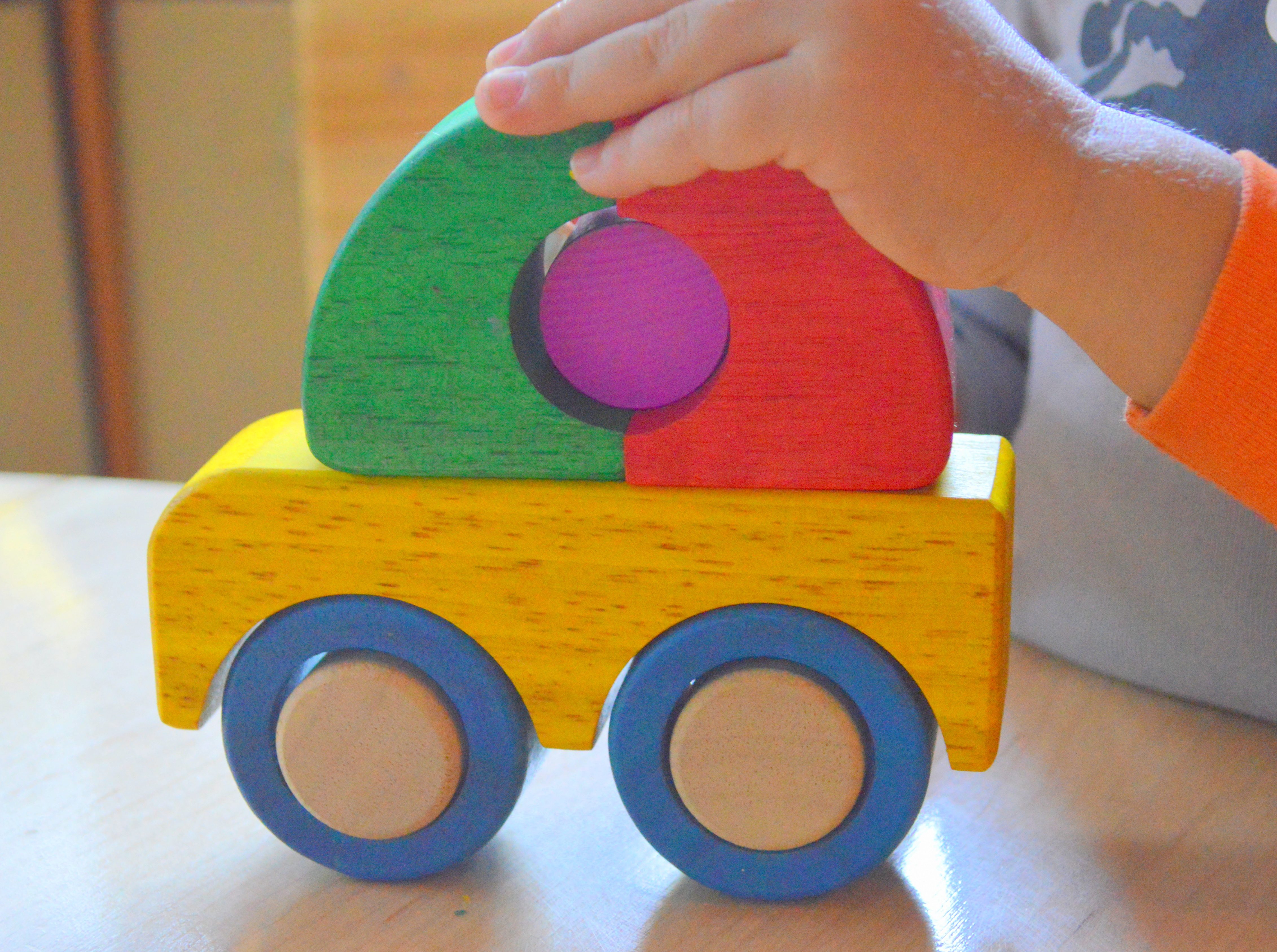 This eco-friendly colorful car puzzle has big, chunky pieces which are easy for toddlers to grasp. Also, introducing puzzles with only few pieces gives a child confidence. I first introduced it to Adrian when he was a year-and-a-half. At almost three years, he still enjoys it. I like a toy that "grow" with your child: even a one year old can enjoy holding these chunky pieces of solid wood painted with bright, non-toxic paints.