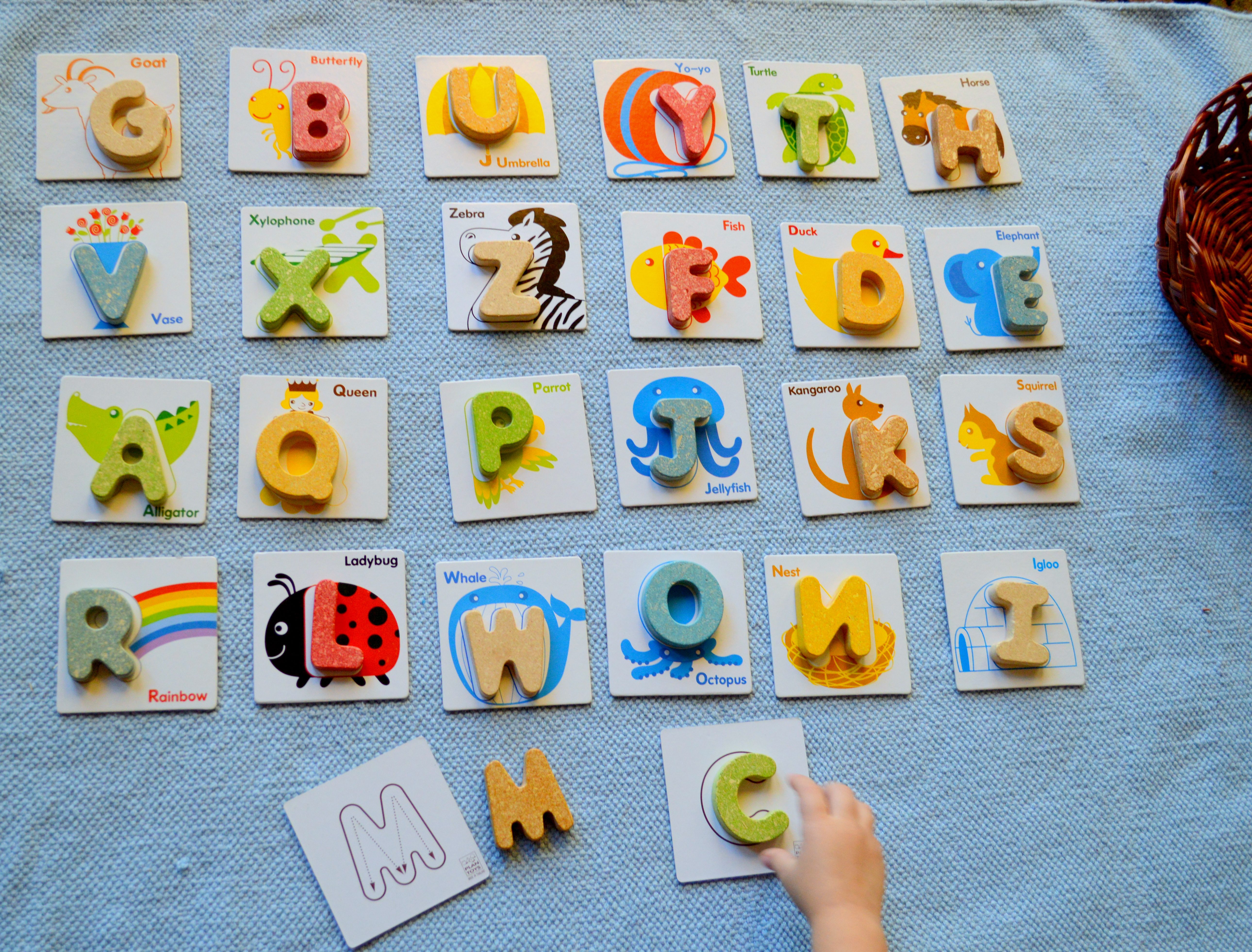 Lastly, Adrian matched all the capital letters to their shadows. These A-Z wooden letters with cards are one of our favorites! Adrian has been doing this activity for about a year now and he still enjoys it greatly. He gets to practice matching, language by naming the corresponding animal, and finally, on the other side of the card, arrows show the directions for writing/tracing the letter.