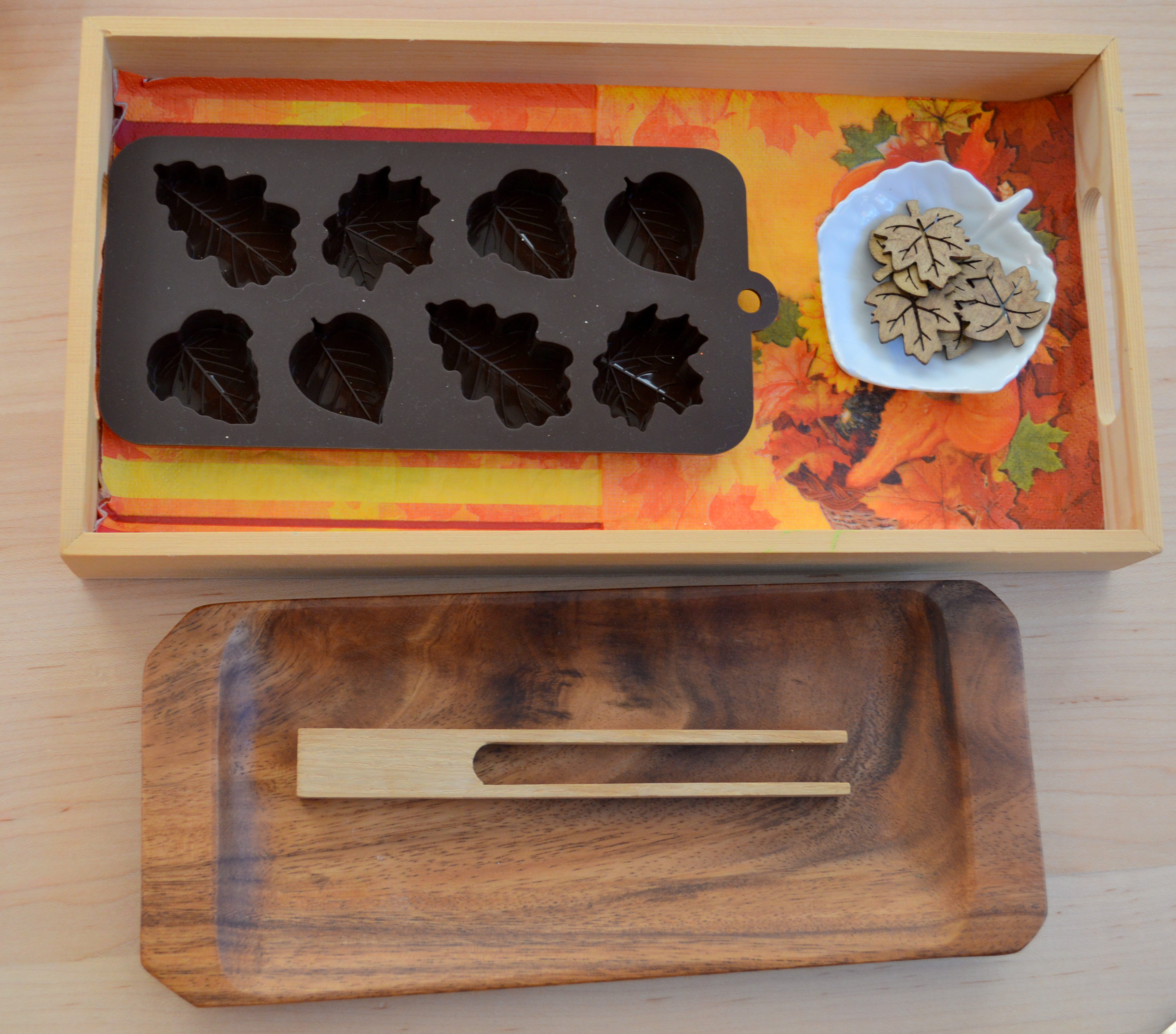 Autumn leaves tray, acorns as transferring objects, and small one-piece bamboo tongs.