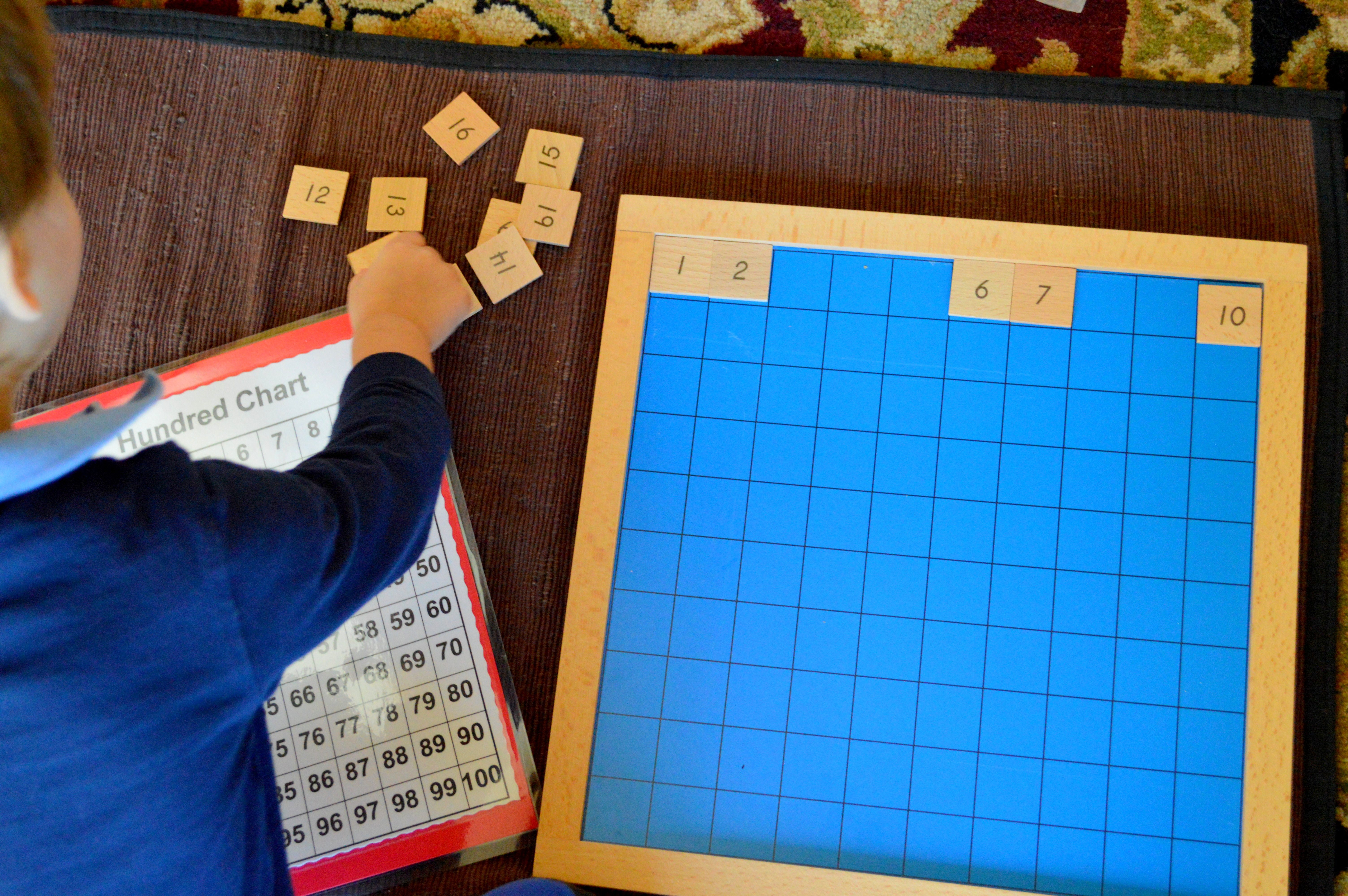 The Hundred Board (buy here) is a traditional Montessori material, consisting of a blank board and wooden numbers from 1- 100. There is also a control chart with all the numbers filled in. The objective is memorization, and an understanding of numbers and their sequence. Also, this material trains the child to work from left to right, top to bottom ~ while teaching counting and skip counting, number recognition, number sequencing, patterning and more.
