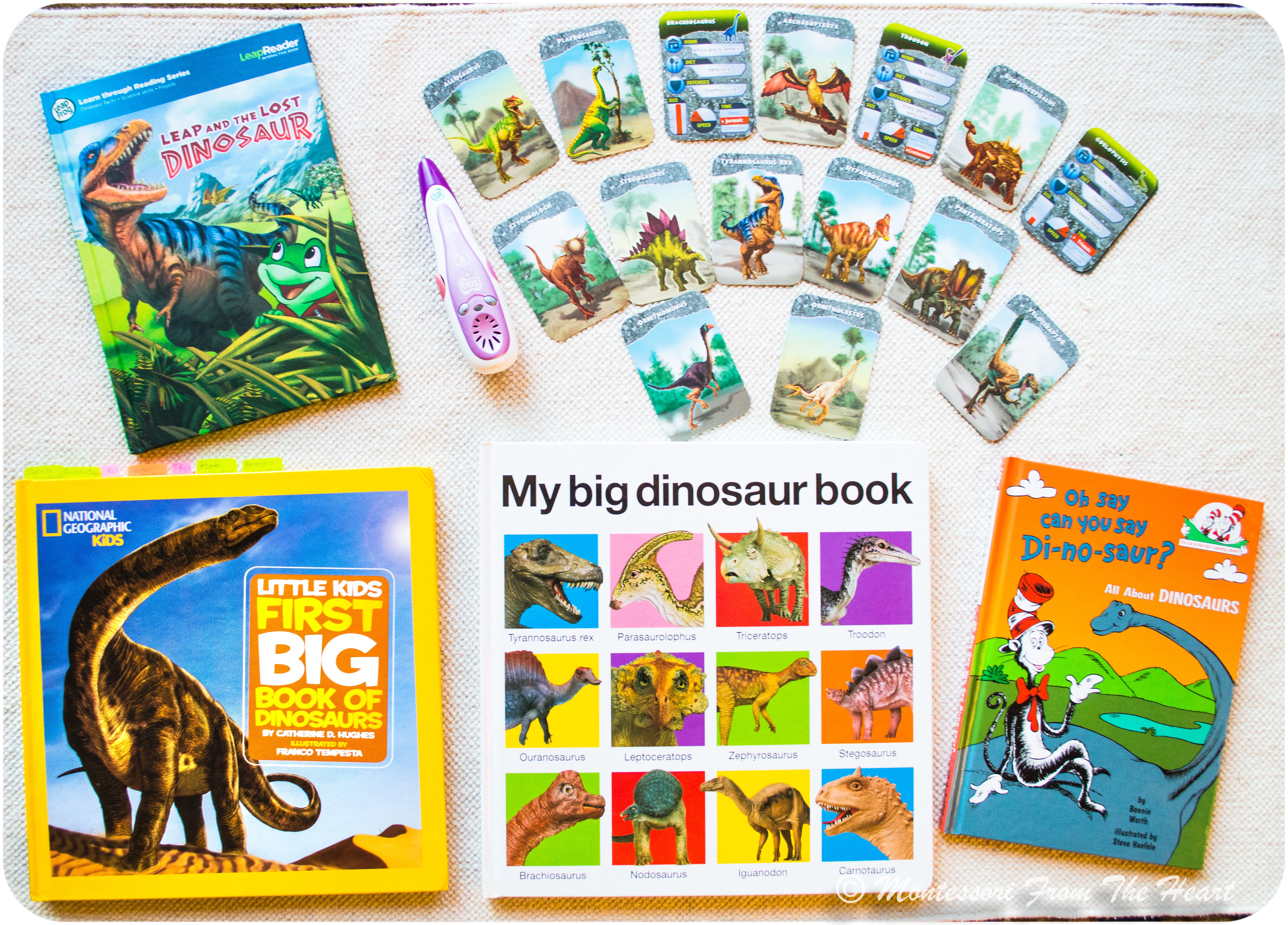 On the top: Leap and the Lost Dinosaur interactive LeapFrog Tag Book (buy here). The book teaches about dinosaur facts, science skills and fossils, and comes with 15 interactive dinosaur playing cards that teach about dinosaur diets and defenses. "Explore the prehistoric world and help Leap and Professor Quigley reunite an adorable dinosaur with her family in this LeapReader book." (Please note that the book works only with Tag Reading System which is sold separately.)