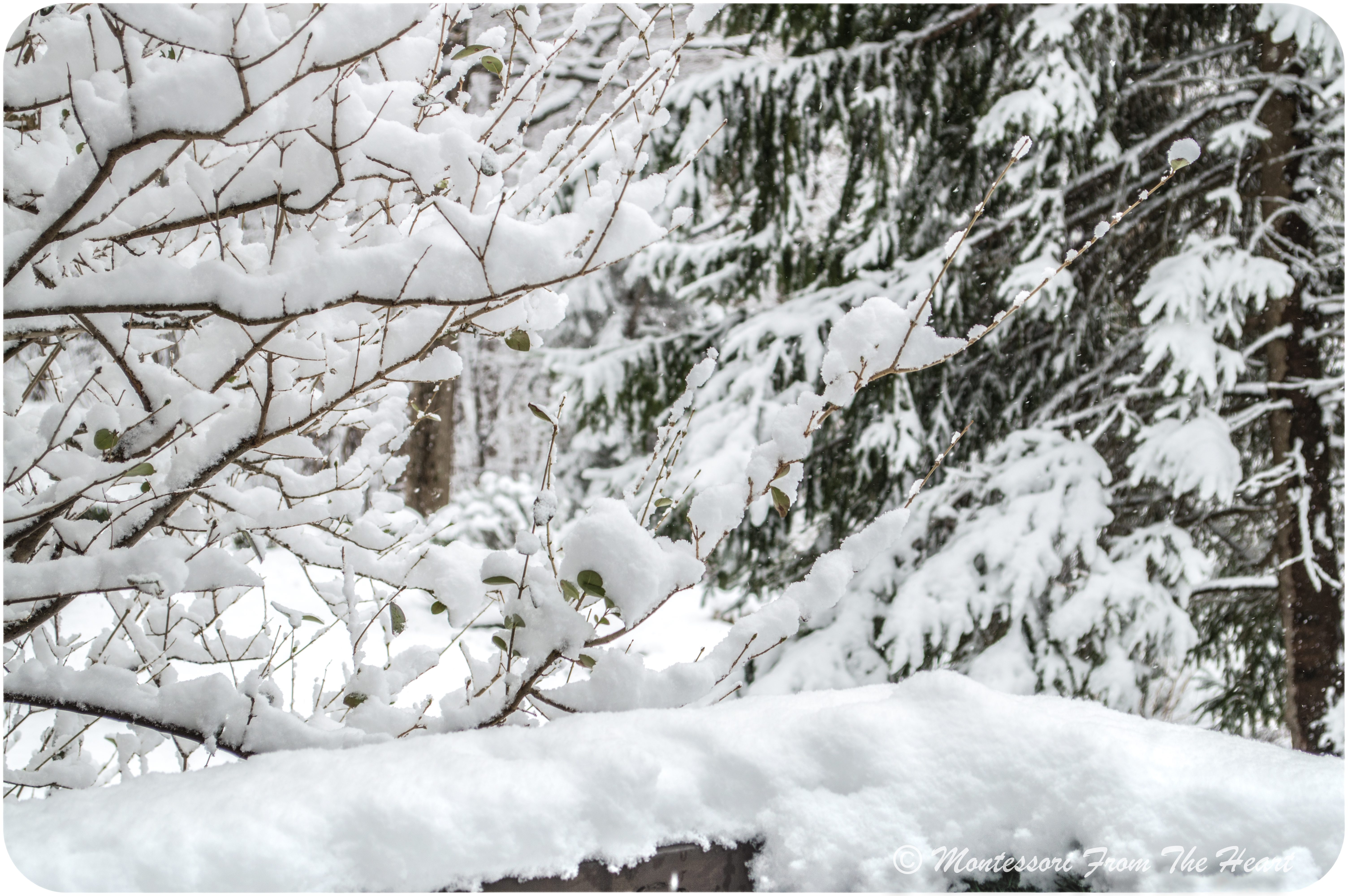 When Adrian woke up this morning, he recited a part of his Winter Poem: "Snowflakes dance throughout the night, when I open my eyes, the world is white!" (See a post here.) And indeed it was:) We usually do not get snow in March, and to see all the buds plump and red, as well as bright yellow daffodils covered by few inches of snow, was quite unexpected!