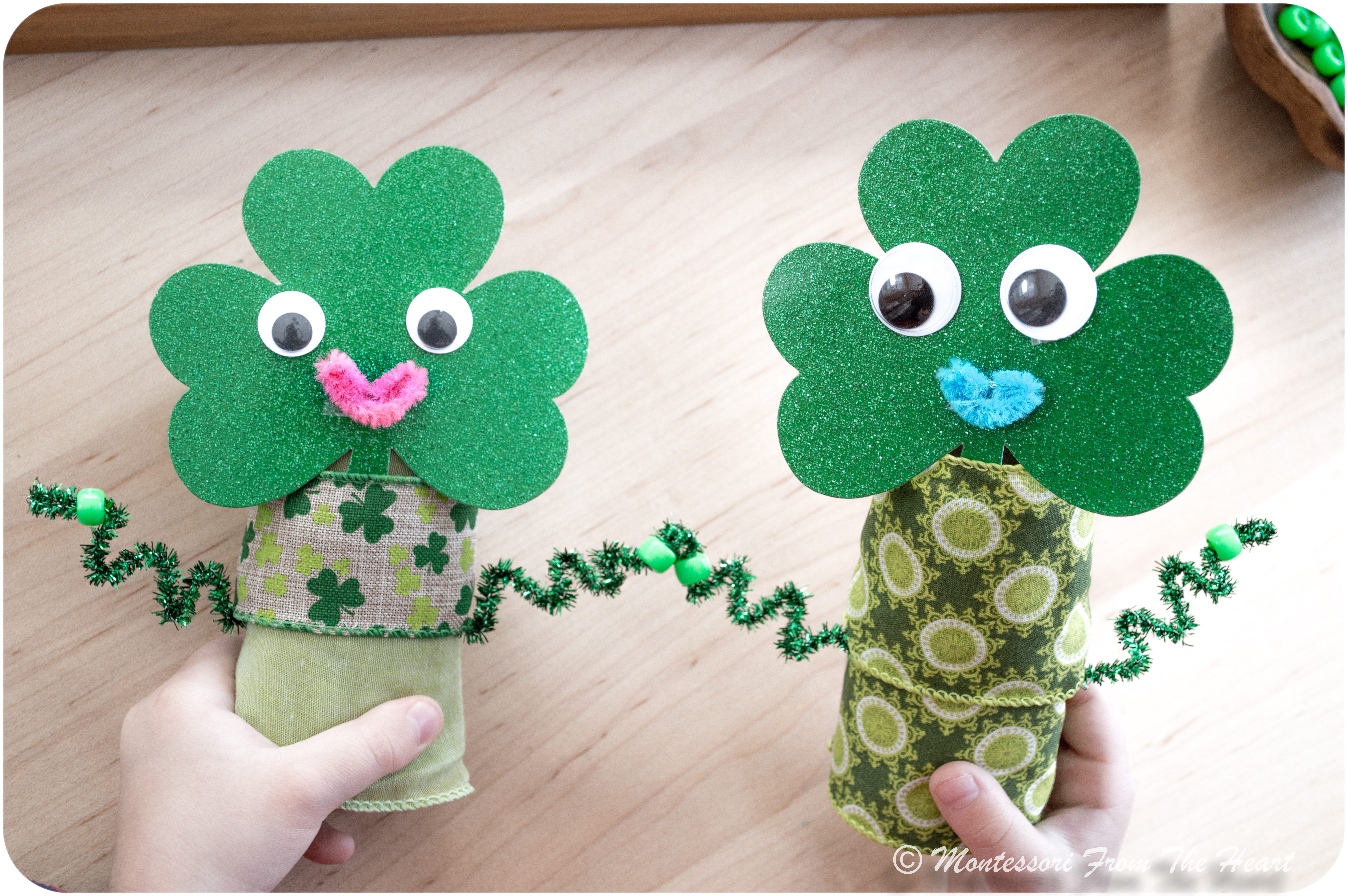 Blue & pink pipe cleaners become Shamrocks'👦🏼👧🏻 mouths.