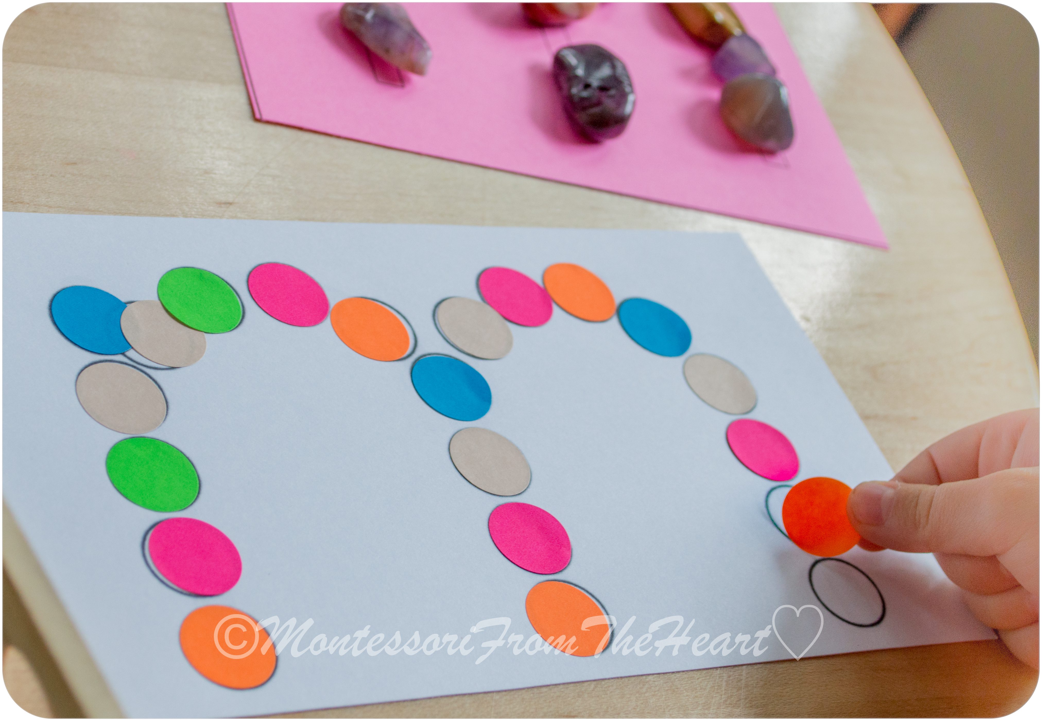 Pattern-tracing lower case "m" with neon dot-stickers (link to a free pdf here).