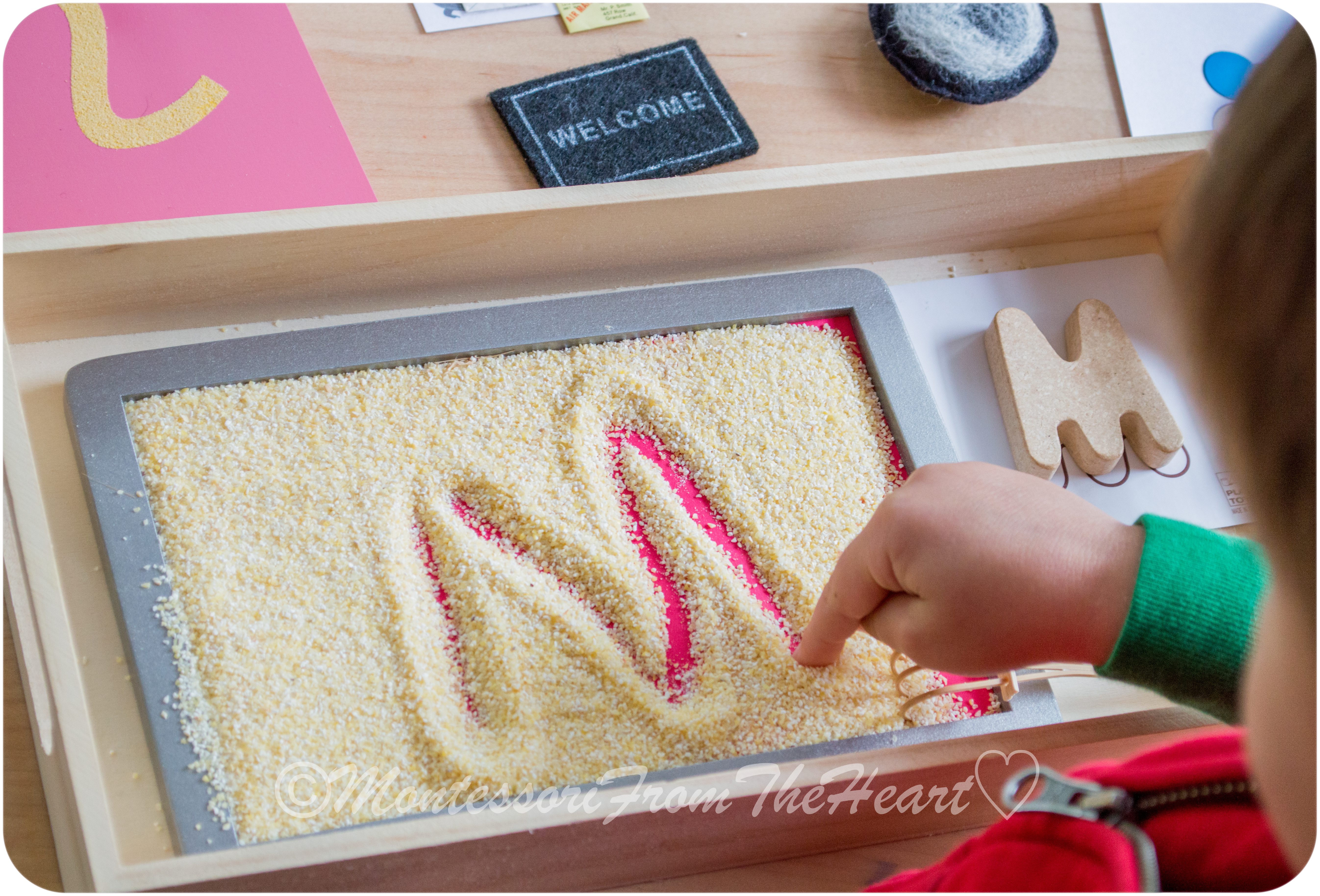 Tracing "M" in a polenta tray adds a sensorial dimension to writing.