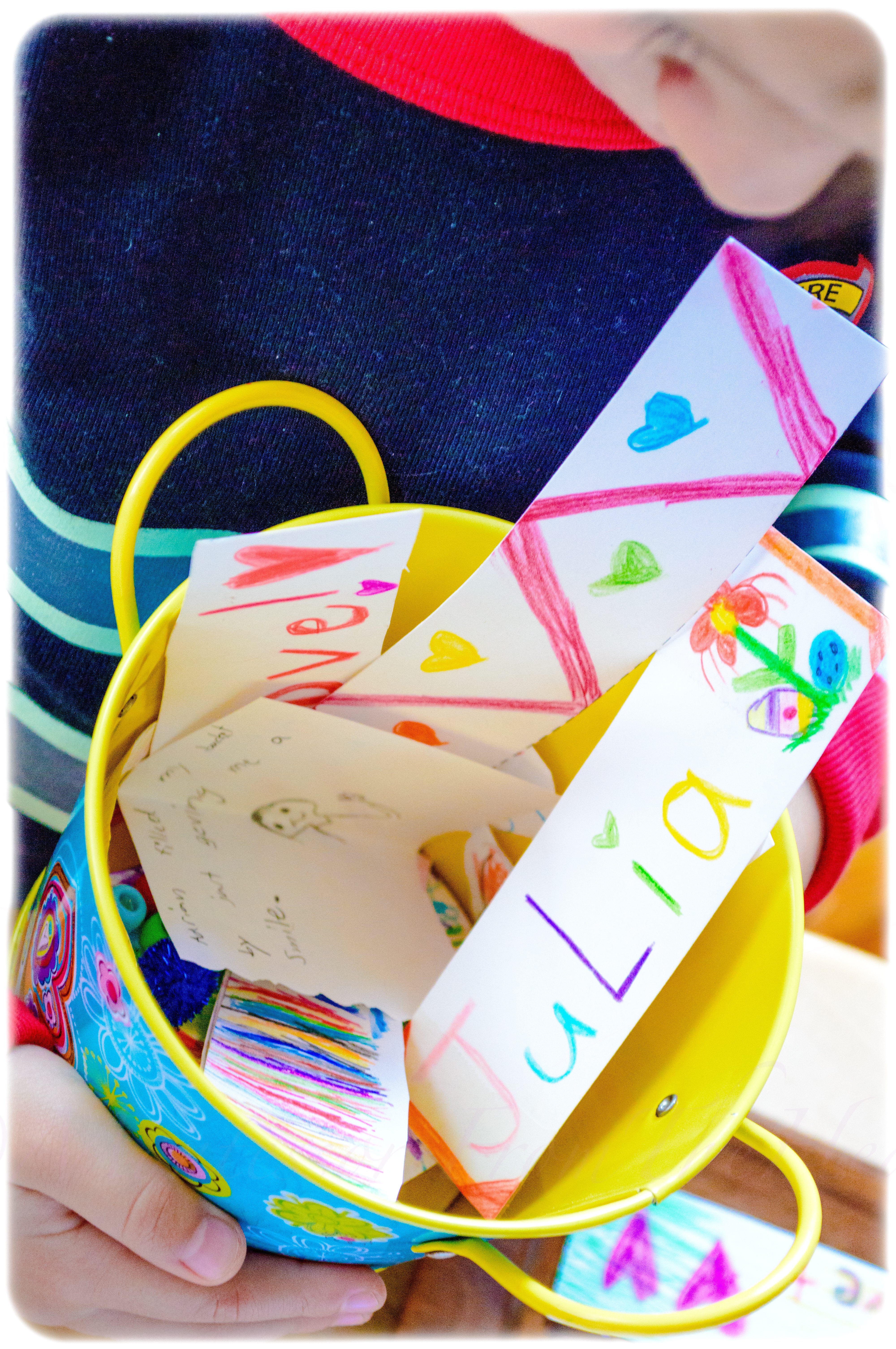 So, our bucket is filled with love notes, hearts, drawings, colorful bookmarks for Mommy and so forth. As such, our bucket helps us be mindful, considerate and compassionate.