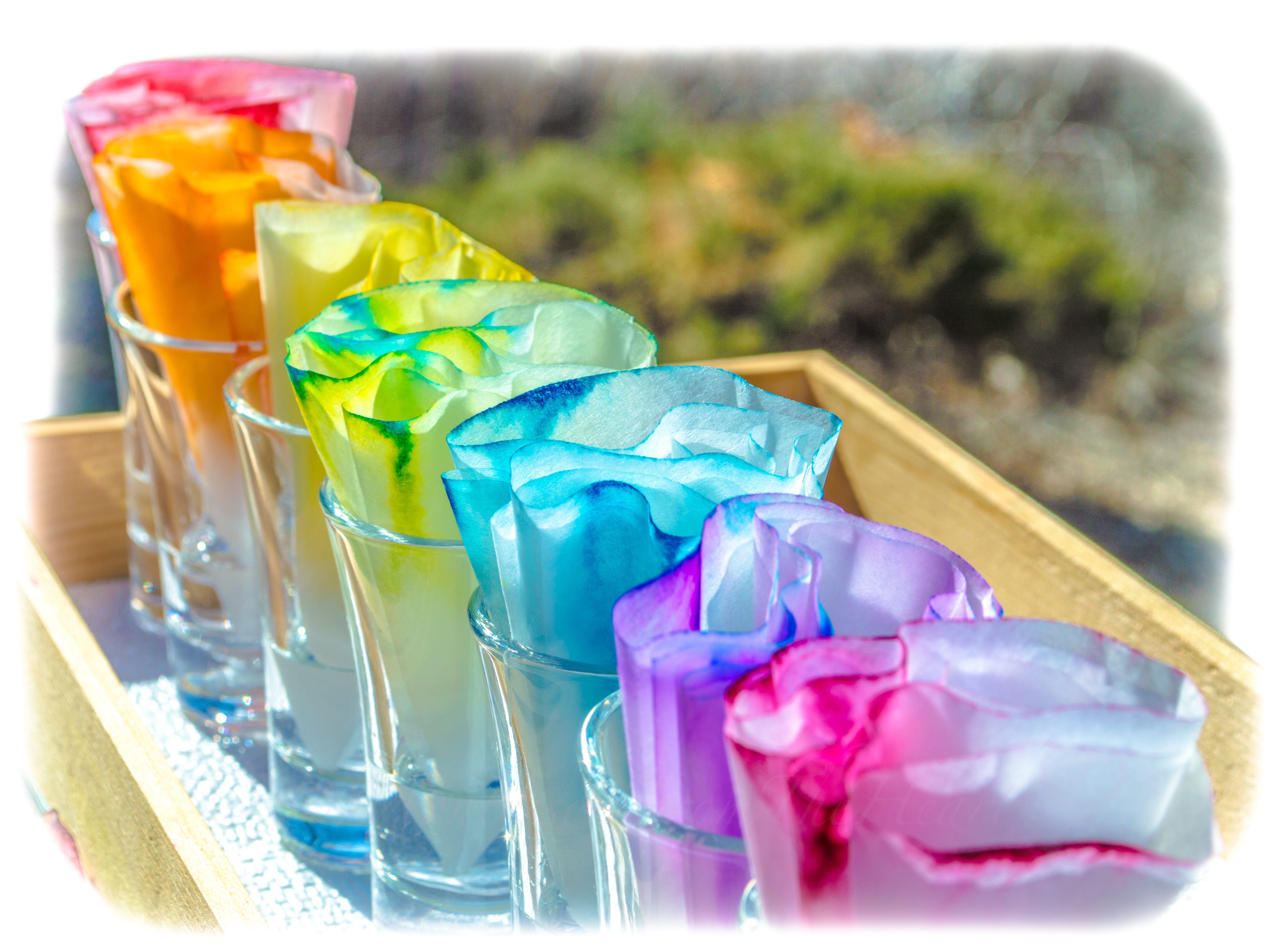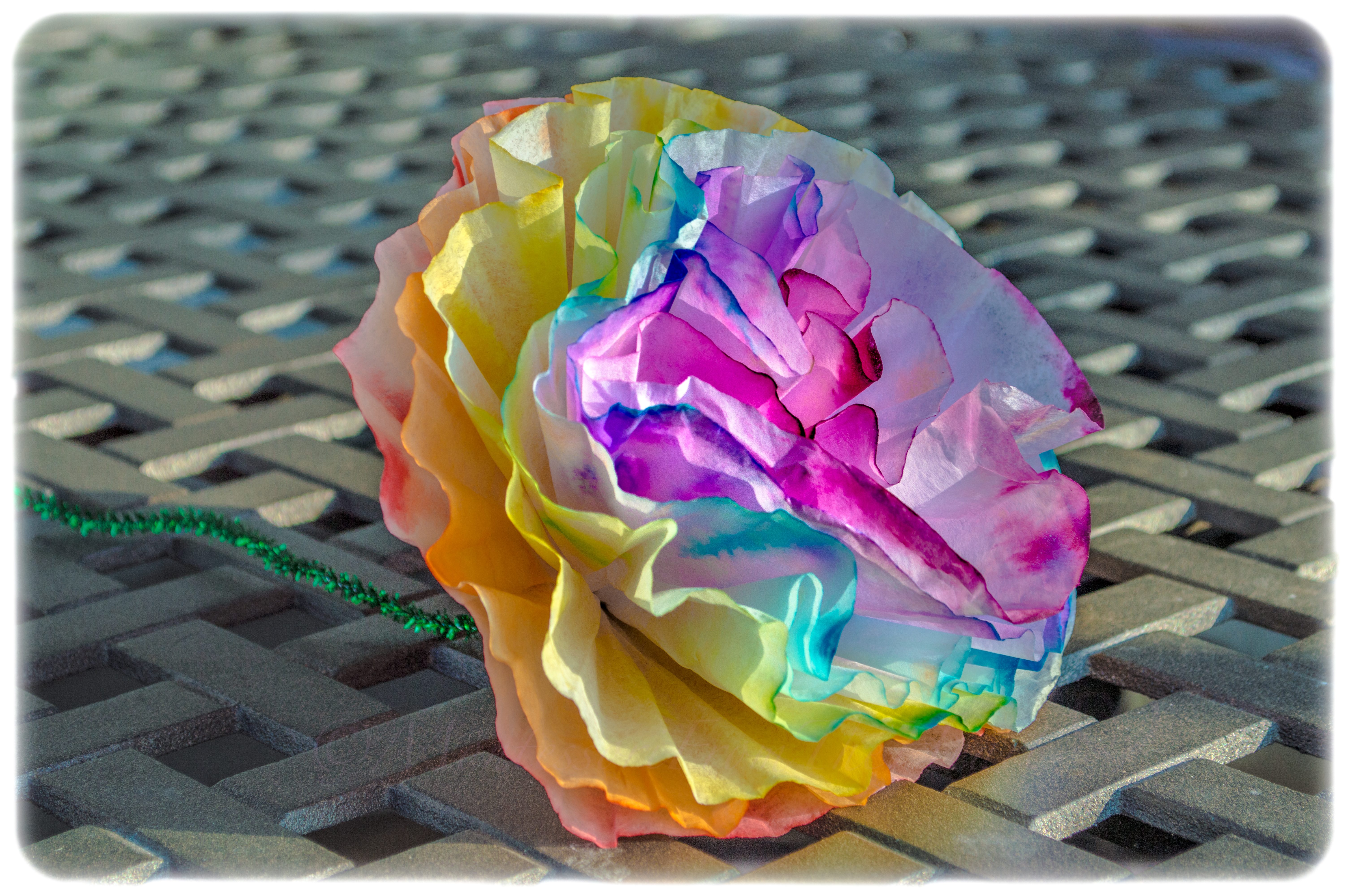 What to do with these beautiful rainbow filters? What about a rainbow flower! Just fold each filter from the center, crinkle it individually and hold all the filters together!